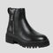 Black, genuine leather, elegant decorative detailing, convenient side zip closure, back pull tab for easy wear, signature logo on the insole, rounded toe, ankle height, and a durable treaded sole for comfort and stability.